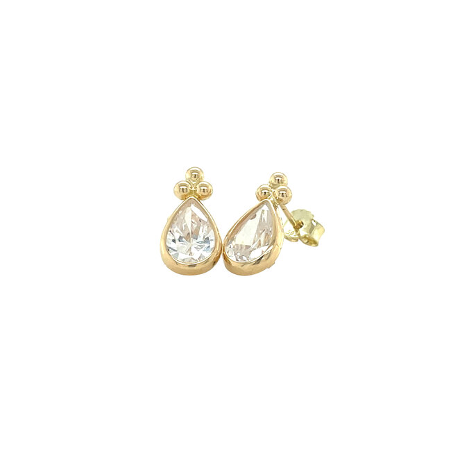 Gelbgoldene verspielte Ohrstecker mit einem Anhänger, der mit einem tropfenförmigen Zirkonia besetzt ist. Lesen Sie mehr.