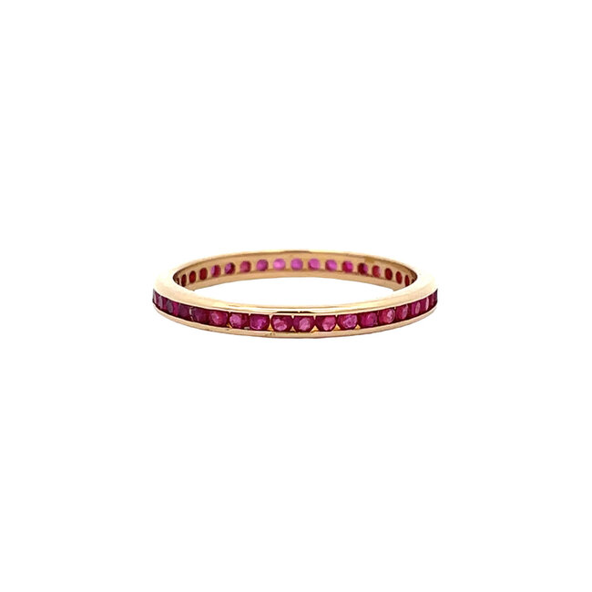 Gelbgoldener Alliancering rundum besetzt mit synthetischem Rubin. Lesen Sie mehr.