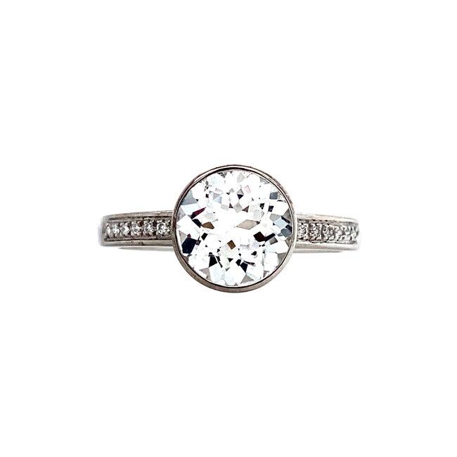 Weißgoldener Ring mit einem großen Zirkonia in einer glatten Fassung und zusätzlich sind Zirkonias in die Ringschiene eingesetzt. Die Ringgröße kann angepasst werden.