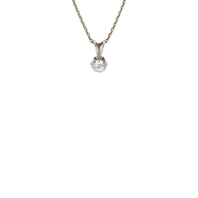 Schöner feiner Weißgold-Solitärahnänger mit einem Zirkonia in einer Spiegelchaton-Fassung. Lesen Sie mehr.