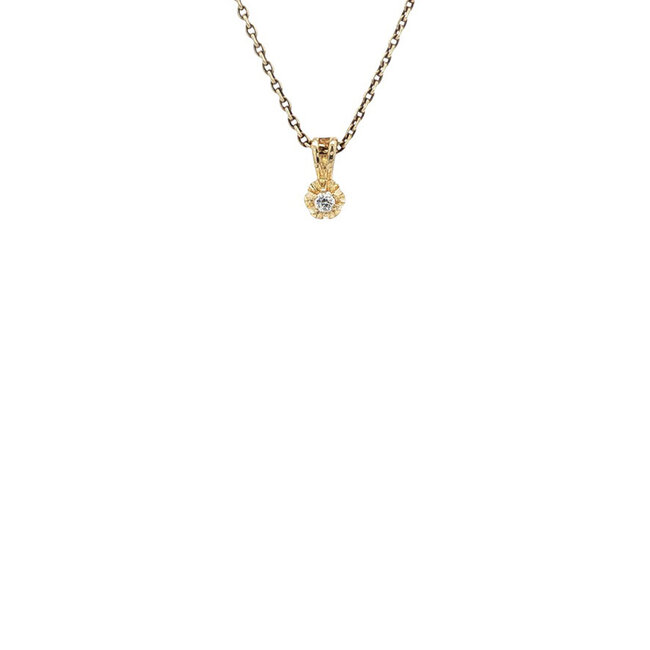 Beautiful delicate yellow-gold solitaire pendant with a cubic zirconia set in a mirror chaton setting Read more.
