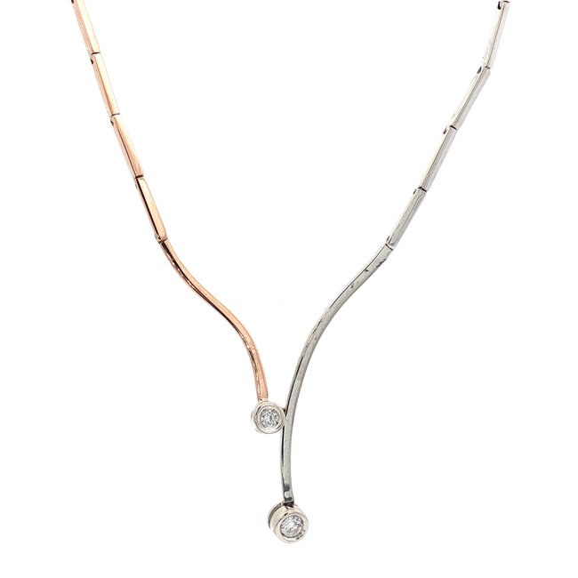 Schitterende choker van een lengte witgoud en de andere lengte rosegoud, welke onderaan samen komen en bezet met twee diamanten in een gladomzetting. Sluit met een baksluiting en een extra veiligheidsachtje.
