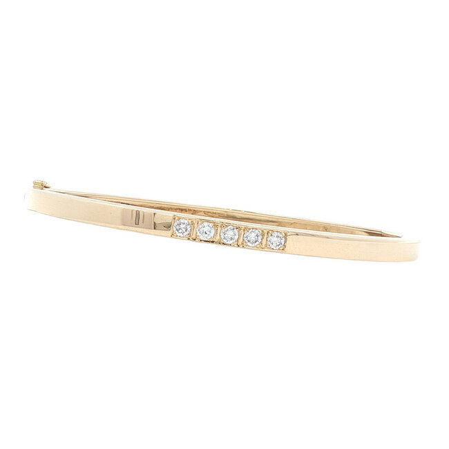 Geelgouden gladde bangle met 5 diamanten op een rij. Sluit met een baksluiting en een extra veiligheidsachtje. Lees meer.