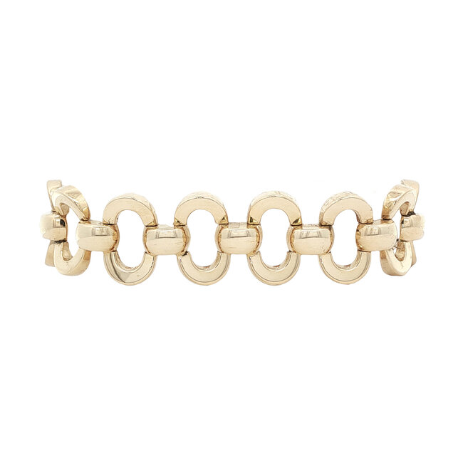Deze stijlvolle geelgouden armband is opgebouwd uit ovale, open schakels die samen een speels, maar tijdloos geheel vormen. Sluit met een baksluiting en een extra veiligheidsachtje.