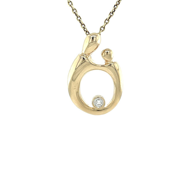 Geelgouden hanger van moeder en kind met een diamant gezet in een gladomzetting. Lees meer.