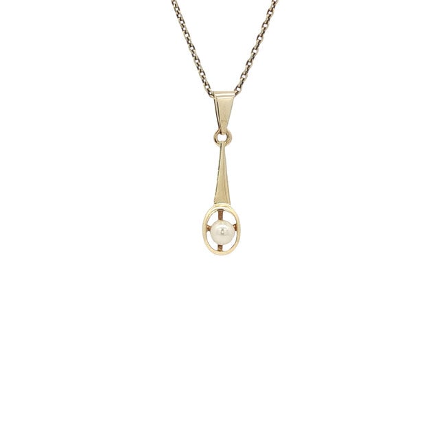 Mooie fijne geelgouden strakke hanger met een witte parel.