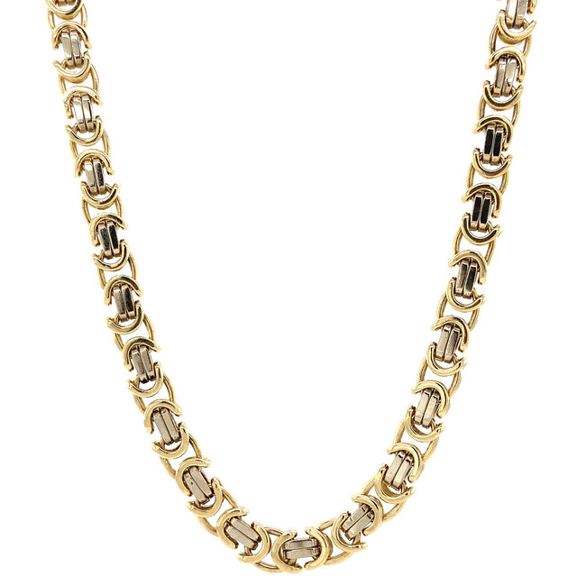Mooie lange gouden collier van bicolour gouden koningsschakels. Sluit met een grote karabijnsluiting. Lees meer.