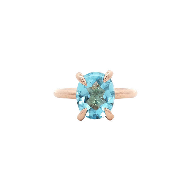 Mooie stevige rosegouden ring bezet met een blauwe topaas in een 4-poots moderne chatonzetting. De ringmaat kan aangepast worden. Lees meer.