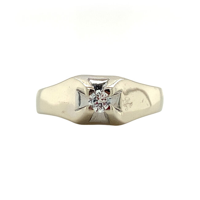 Witgouden pinkring bezet met een diamant in een 4-poots chatonzetting. Dit model wordt pinkring genoemd, maar kan natuurlijk ook om een andere vinger gedragen worden.